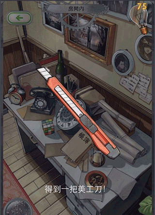 2、 镜头转到桌面上,点开笔筒能拿到一把美工刀。桌子第一个抽屉是空的,别浪费时间。点开左下角的道具栏,选中刚拿到的美工刀,去划墙上那幅写着“SAVE ME”的画,能得到一枚双子座硬币。