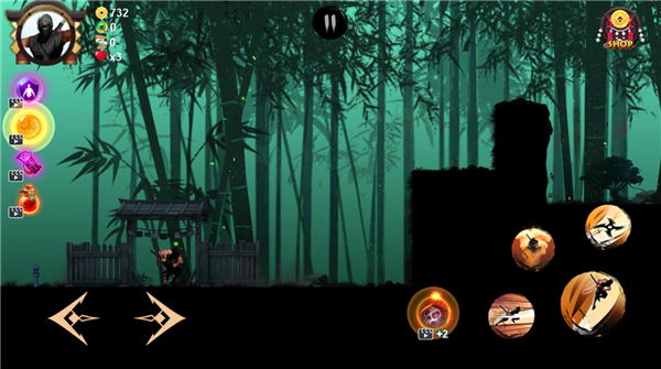 2、操作布局挺常规的,左手摇杆控制左右跑,右手那几个键分别是跳、普通攻击、冲刺砍人,还有一个是隐身键。
