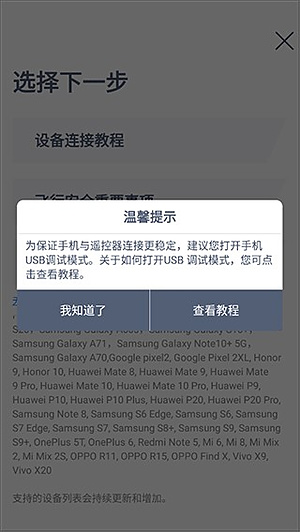 3、选完飞机型号,划重点,为了手机和遥控器连得更稳,最好把手机的USB调试模式打开。