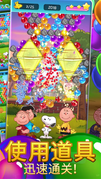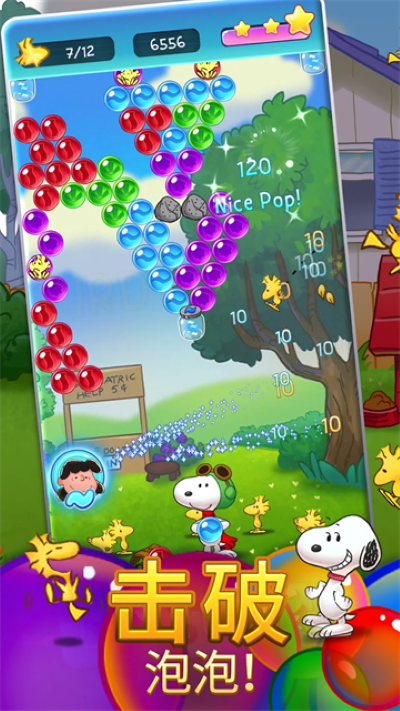 游戏背景不是一成不变的贴图,这点做得不错。你在底下打泡泡,上面的场景是动态的,角色也会动。比如史努比会懒洋洋地趴在它的狗屋上,查理布朗在院子里晃悠。从史努比的小窝到露西那个“心理咨询”小摊,再到薄荷派蒂的冰球场,每一关的场景都来自《花生漫画》里的经典地点,代入感挺强。