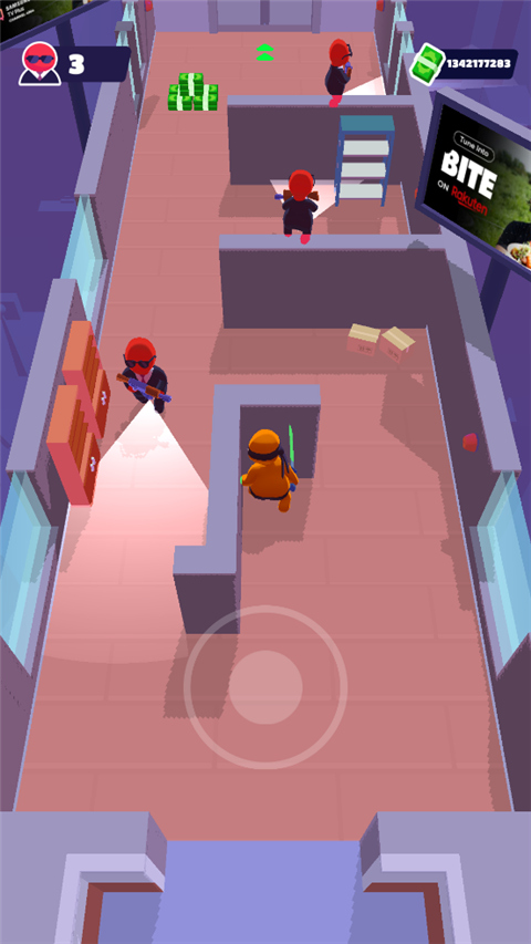 4、操作就是点着屏幕让角色在不同房间里移动。每个房间都有几个穿黑衣服的守卫站岗或者巡逻。