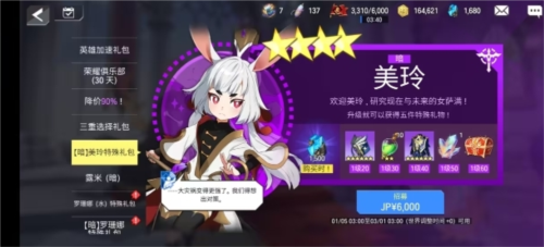这个叫暗美玲的角色,你要是打算长久玩下去,那我建议你咬咬牙直接买了。价格大概在300块上下,附赠1500晶石。我为啥没买?还不是因为穷。
