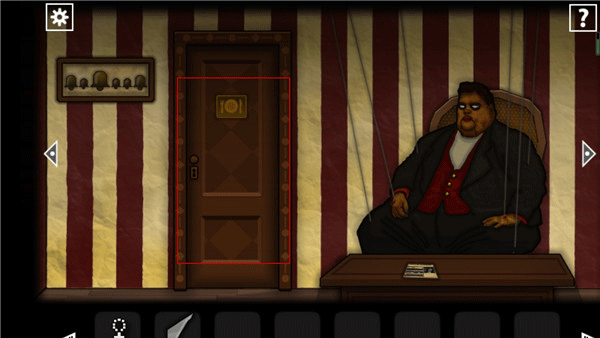 4、从厕所出来往右边走,进那个胖子木偶旁边的大门。进了这个房间,地上有个餐盘,上面有一坨黏糊糊的东西,捡起来。