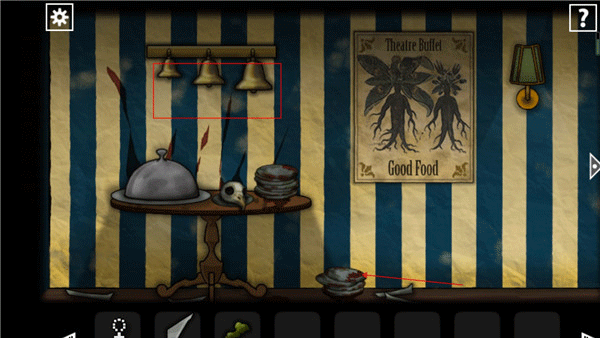 5、看到上面那个铃铛没,按照213112的顺序敲,敲对了下面的餐盘就会打开,里面藏着一个眼球。