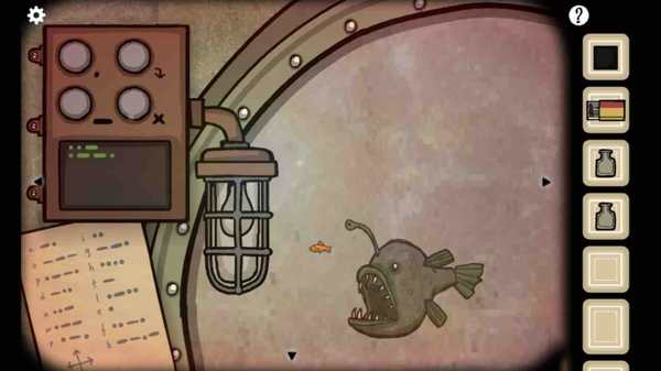 1、先看窗户,会游过来一条鮟鱇鱼。旁边就有个摩尔斯电码表,对着它敲出“up”和“left”,鱼就会给你一个密码“ink”。直接看下面这张截图,照着弄就行。