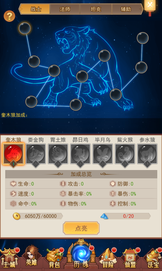 战士、法师、坦克、辅助这四个职业,分别对应四张不同的星宿图。每张图都只对自己那个职业有加成效果。升级星宿图要用“迷雾之尘”这个材料,每打过一关就能领一些,然后就可以拿去升级了。