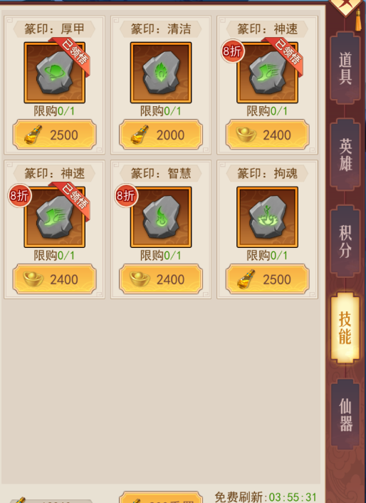 这个方法比较适合氪金玩家,可以去技能商店用元宝买篆印,然后再分解掉,这样能很快地拿到大量鎏金粉。