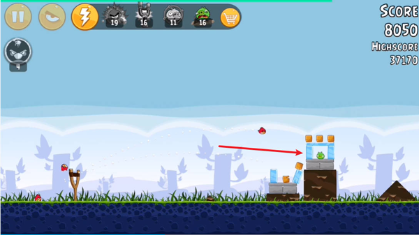 进了游戏,屏幕上会有提示和红色的辅助线教你怎么玩。说白了,你的任务就是用弹弓把鸟射出去,砸中目标。