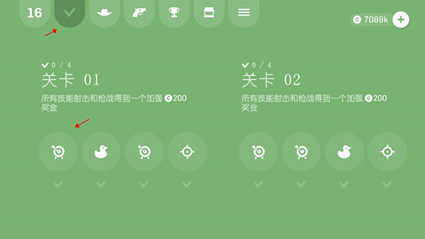 2、看到左上角那个“√”符号没,点它就进了关卡选择。每个大关有4个小关,打通了就有奖励拿。