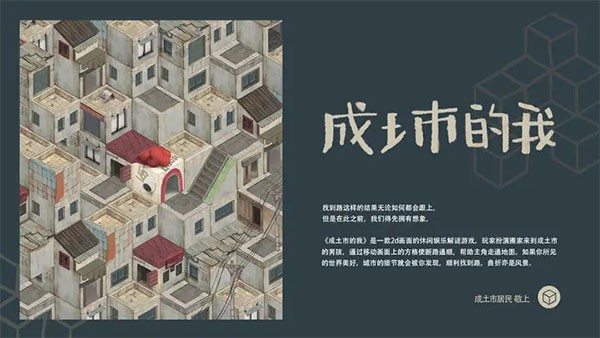 《成土市的我》是一款画风治愈的冒险解谜游戏,玩家需要通过移动方块来为主角搭建道路,找回城市的色彩。游戏考验玩家的空间想象力和观察力,适合喜欢休闲益智类游戏的玩家在碎片时间放松游玩,一同拼凑出主角背后的故事。