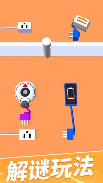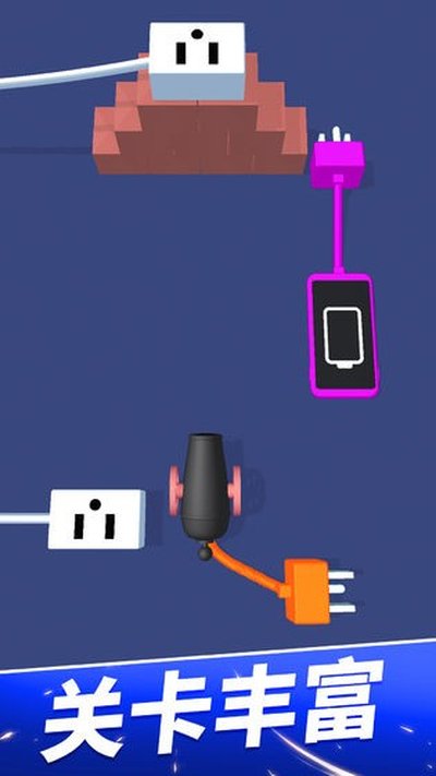 这游戏的玩法说白了就一句话:用一根手指头拖着插头, 把它怼进正确的插座里, 不管是给手机还是给笔记本充电, 只要通上电就算过关。别看开头简单, 玩到后面关卡设计就开始不当人了, 各种桌子腿、挡板之类的障碍物都冒出来了, 你得绕着走才能充电成功。顺带一提, 游戏里还有一大堆皮肤给你收集, 什么奇形怪状的插座、花里胡哨的插头, 都能在闯关的时候解锁。就是不知道你们能集齐多少种, 反正我目前的进度还很一般。