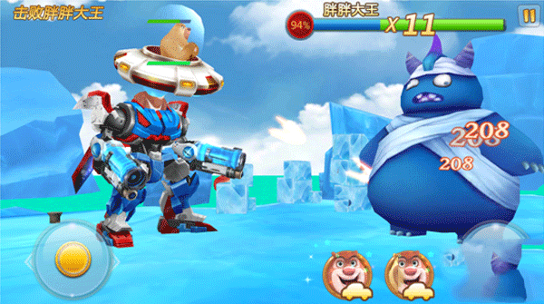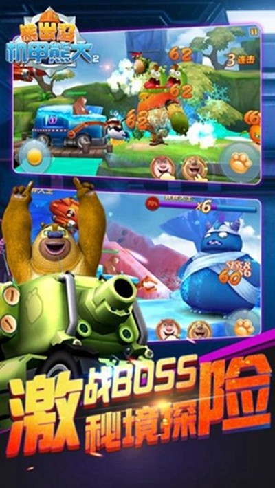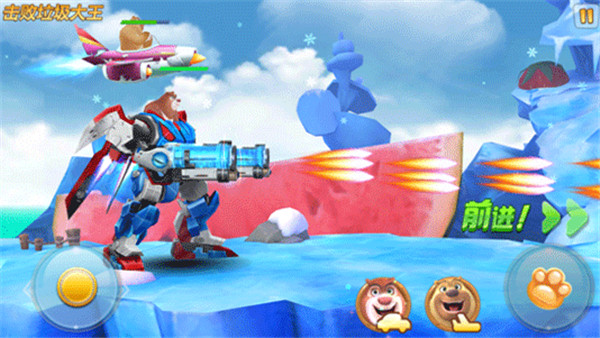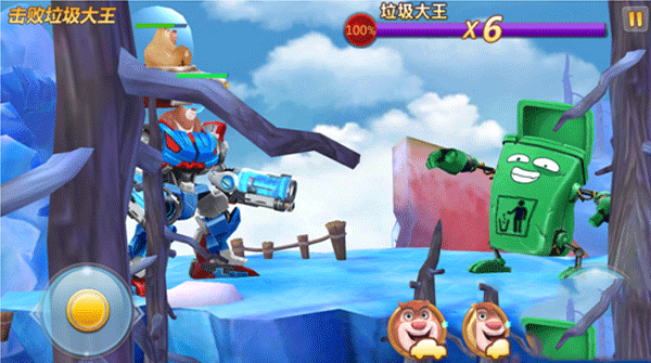 3、正宗机甲元素:游戏主打的就是合体闯关,机甲元素非常正宗,带你体验一个完全不一样的熊出没冒险之旅。