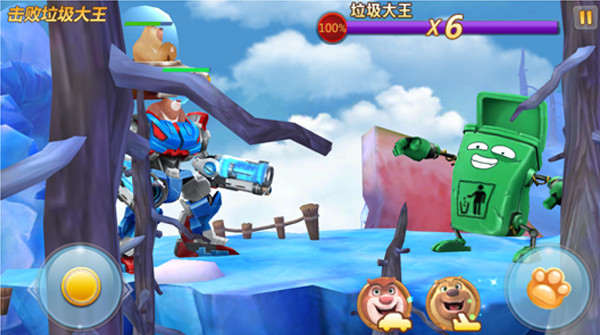 游戏里的角色形象和配音都是动画原版的,一听就有内味儿了。你扮演的就是熊大熊二,开着飞机机甲保卫森林,代入感很强。