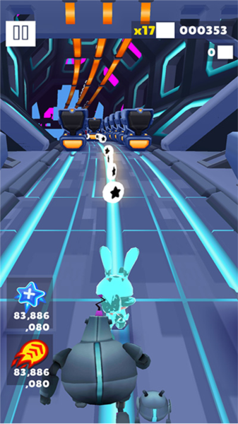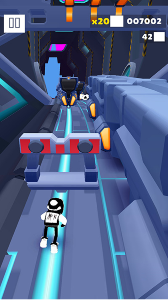 - 跑起来之后,轨道上啥玩意都有,箱子、栏杆、迎面开来的火车。反应快点,该跳跳该滚滚,一头撞上去直接就没了,游戏结束。