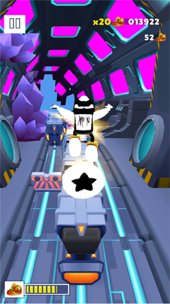 - 往上划屏幕就是跳,用来躲障碍或者上火车顶。往下滑就是下铲,过一些低矮的通道或者躲天上的东西。没开玩笑,这都玩不明白就别碰跑酷游戏了。