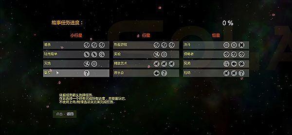 6、初始你就是块陨石,周围有四个箭头指引方向,跟着走就能找到任务。每个箭头代表啥我也没搞太明白,但完成不同箭头的任务组合能解锁故事模式的称号。不同成长阶段,每个箭头的任务也不同。