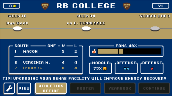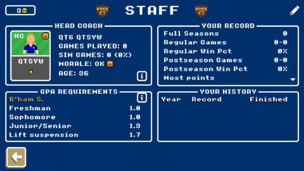 《复古橄榄球学院》是一款以美式橄榄球为主题的体育竞技游戏,玩家将扮演球队管理者与指挥者,带领队伍在赛场上不断挑战对手,体验策略与操作结合的竞技乐趣。游戏采用复古像素风格设计,整体画面简洁却富有表现力,搭配流畅的比赛节奏,让玩家在怀旧氛围中感受紧张刺激的对抗体验。在游戏过程中,玩家不仅需要控制比赛中的战术执行,还要参与球队建设与阵容调整,通过合理搭配球员来提升整体实力。比赛机制融合了策略与即时操作,玩家需要根据场上局势灵活调整进攻与防守方案,从而在关键时刻取得优势。随着游戏推进,可以解锁更多球员与内容,逐步打造属于自己的强力球队,体验完整的橄榄球竞技成长过程。整体玩法兼顾深度与易上手性,新手可以快速理解基础规则,同时也能在深入体验中感受到策略层面的变化与挑战。