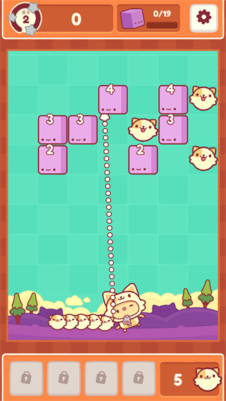 1、玩法很简单,砖块上标着数字几,就代表要撞几下才能把它干掉。你就不断发射猫球,让它在里面来回弹,把数字磨光就行了。大家看下面这张截图,一目了然。