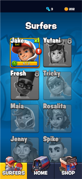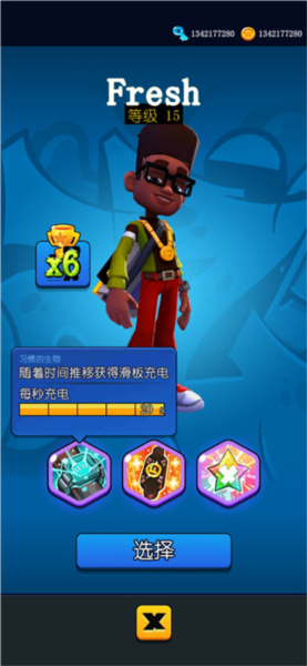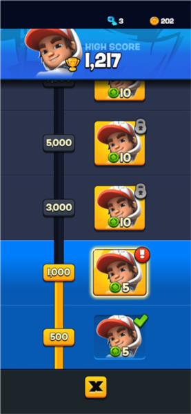 6、分数越高,拿到的升级奖励就越多。每个角色都有自己的一套技能,比如杰克,升到一级技能是送个磁铁,二级是吃金币给滑板充能,三级更直接,开局就送一块滑板。