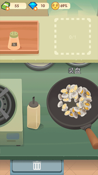 8、炒好了就装盘。要是手残炒糊了或者觉得自己做得不好看,旁边有垃圾桶,直接扔了重做,别砸自己招牌。