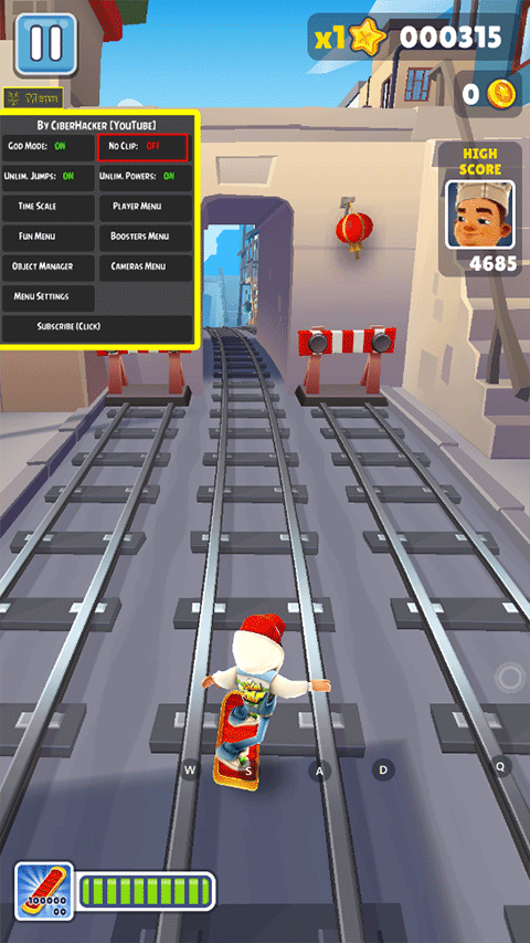 2、找到“No Clip”这个选项点了,然后你就能在火车轨道里横着走了,畅通无阻。