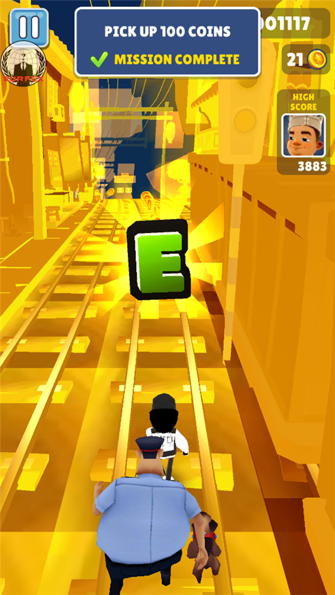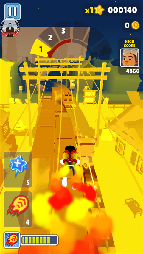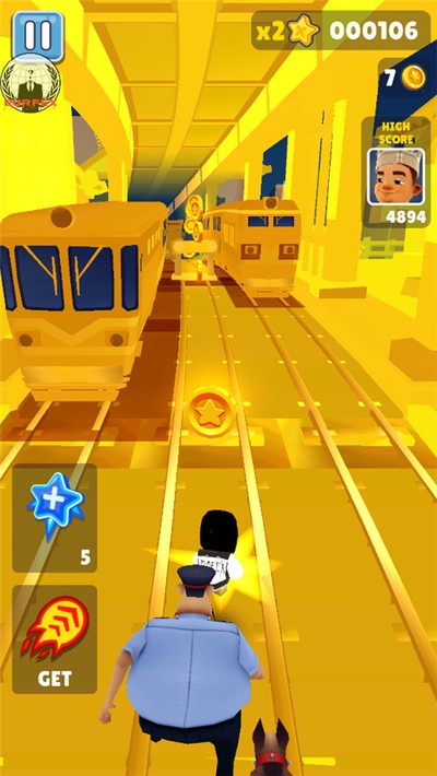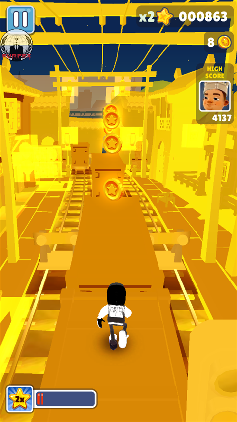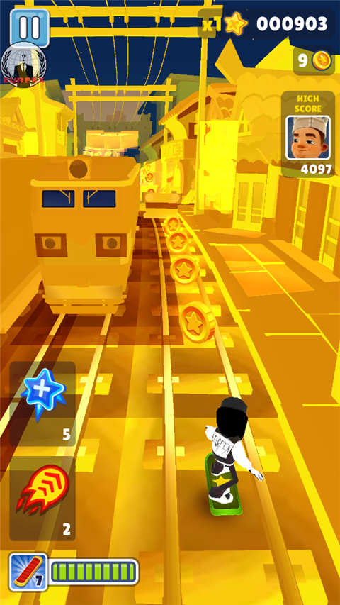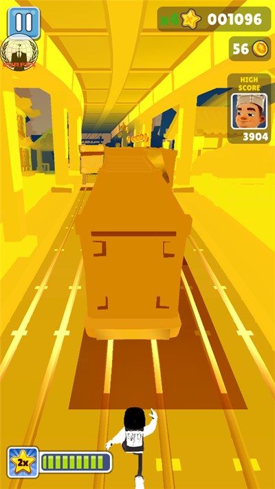 2、尽量在火车顶上跑,上面的视野比地面好太多了,能提前看到障碍物,安全系数高。而且金币的摆放路线基本上就是官方给你指的路,跟着金币跳就行。
