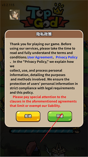 1、刚打开游戏,会跳出个协议啥的,直接点同意就完事了,别想太多。