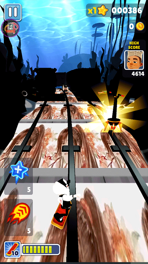 2.除此之外,这个版本的地铁跑酷也塞给玩家一堆道具用。每种道具的效果都不一样,各有各的用处。比如有的能让你跳得更高,有的能直接带你飞上天,还有的能像吸尘器一样把轨道上的金币全吸过来。用好这些道具,绝对是刷高分的关键。对跑酷游戏还有热情的哥们,可以下来挑战一下自己的极限。