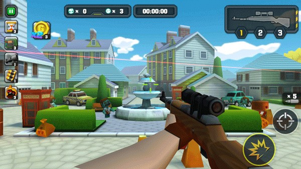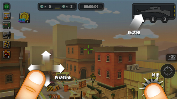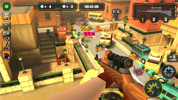 游戏里会随机刷出被僵尸围攻的平民,你的任务就是把他们身边的僵尸全干掉,让他们安全跑到屋子里。注意,一关里要是挂了3个平民,任务直接失败,所以看到平民得优先救。