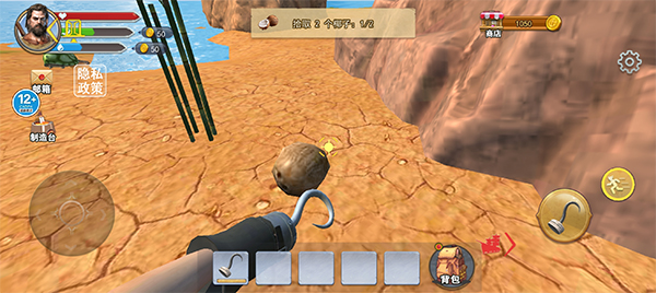 1、刚进游戏别瞎跑,抬头看屏幕上方的任务提示。系统给的第一个活儿就是让你捡俩椰子,这玩意儿满地都是椰子树,过去对着树敲就完事了,贼简单。给你们看下截图,就是这么个界面。