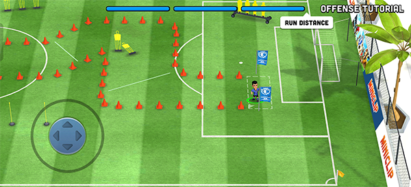 2、操作逻辑其实很简单,就是让你顺着地上的箭头跑到终点,熟悉一下怎么带球。看下面这张截图,就这么个意思。