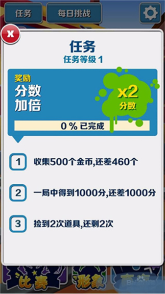 游戏的基础速度是靠完成任务(mission)来提的,总共30个任务,每完成一个速度就提一档,全做完就是30倍速。很多萌新不知道这回事,所以一直低速跑,觉得没啥挑战,分数也低。所以对想冲榜的人来说,上手第一件事就是先把这30个任务给清了。