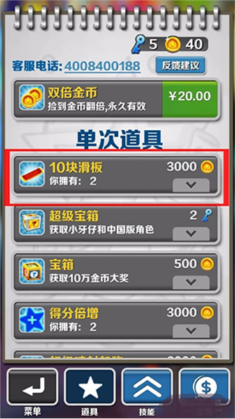 2、金币得攒着,攒够了就去商店里买技能和道具。加速度、磁铁、滑板这些都是消耗品,跑高分全靠它们,所以平时多吃点金币没坏处。