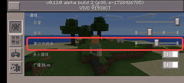 2、在选项里找到“第三方视角”,右边有个条可以来回拖动,总共三种视角。讲真,这UI设计稍微有点复古,不过功能没毛病。调好了退回菜单再点“回到游戏”就生效了。