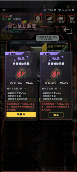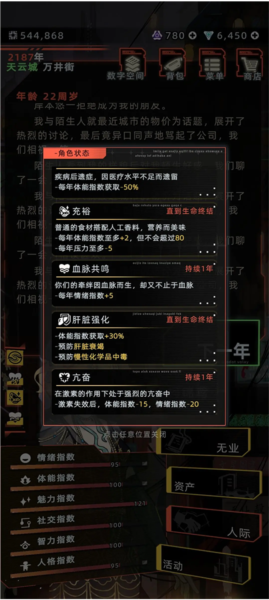 提醒一句:你要是没装上面那个肝脏辅助装置就瞎磕,磕多了有几率直接“肝脏衰竭”,下一年人就没了。就算装了装置,也会有个“亢奋”的副作用,下一年体力减15,情绪减20,不过好在这玩意不叠加。