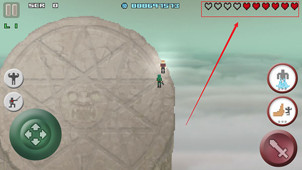 4、右上角那几颗红心就是你的血条,掉光了或者自己脚滑掉下台子,都直接GG。打死某些怪会爆钻石和血球,手速得快,赶紧捡。