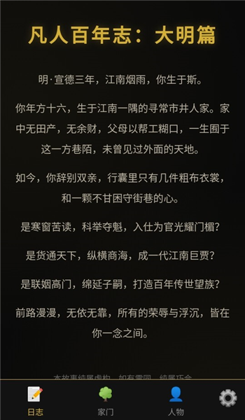 《凡人百年志:大明篇》是一款以明朝为背景的文字模拟角色扮演游戏,玩家将扮演一位江南穷小子,体验从零开始逆袭人生的过程,可选择科举、经商或家族传承等多种发展路线,游戏画风水墨写意,剧情丰富自由,适合喜欢沉浸式体验古代人生、追求高自由度玩法的玩家。