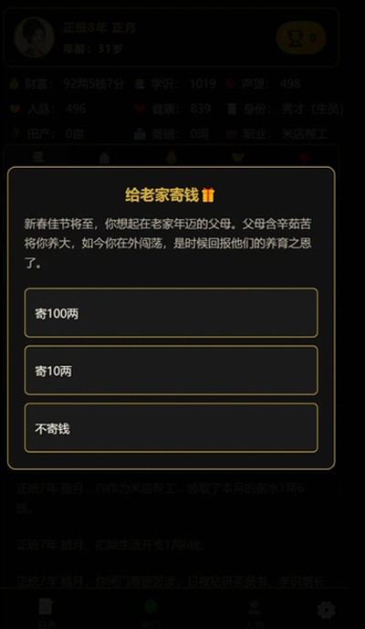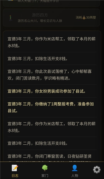 2、探索过程也挺有意思,你得靠着文字描述去想象和探索这个江南世界。路上能搞到粮食、银子、道具、技能点这些资源,但都不是无限的。你得算计着怎么用,不然可能连生存都成问题,更别提解决剧情里的麻烦了。怎么把有限的资源用在刀刃上,是个技术活。