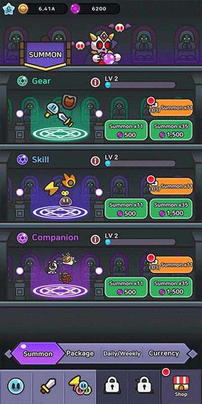 3、想搞装备的话,点右下角进商店界面。看到截图里这个界面没,第一个池子抽装备,第二个抽技能,第三个是抽宠物的。你们看自己缺啥就抽啥。UI稍微有点复古,但功能确实没毛病。
