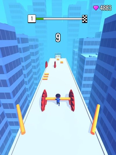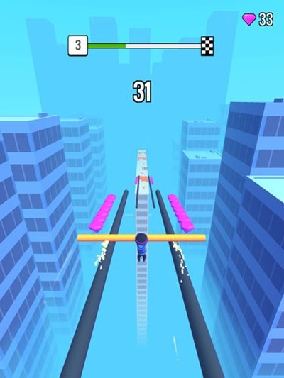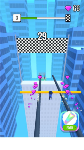 1、你得控制那个小人在楼顶上飞檐走壁,关键技巧就是尽可能多地收集地上的短棍。只有把手里的棍子搞得足够长,才有资本去挑战后面那些越来越变态的关卡。
