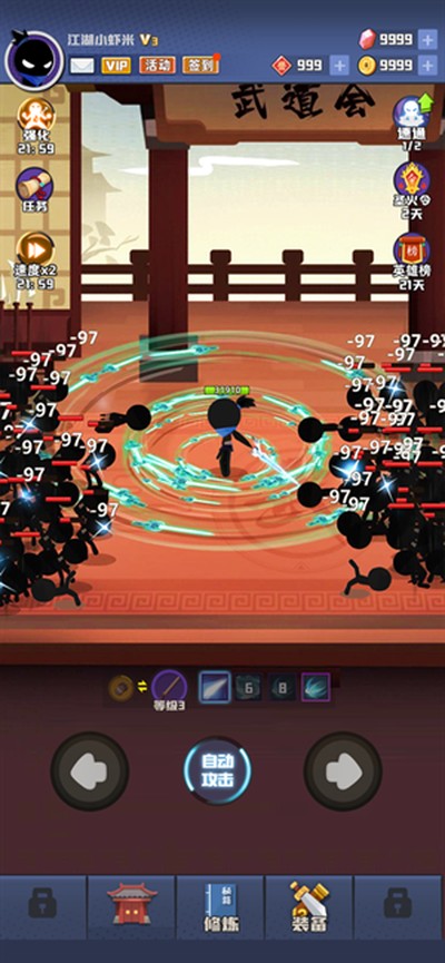 核心玩法就是收集各种装备,解锁一堆武功秘籍和技能,把你的火柴人往死里强化。还能自己建个门派,拉上朋友一起玩,在这个武侠世界里组队打打BOSS,也算有点社交性。