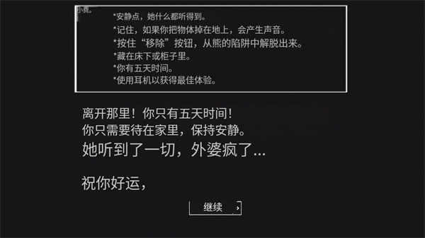 4、玩这游戏必须戴耳机,把音量开大。这样你才能听清老太太的脚步声、开门声。她开门是“吱嘎”两声,关门就一声,这是基本功,得记牢了。