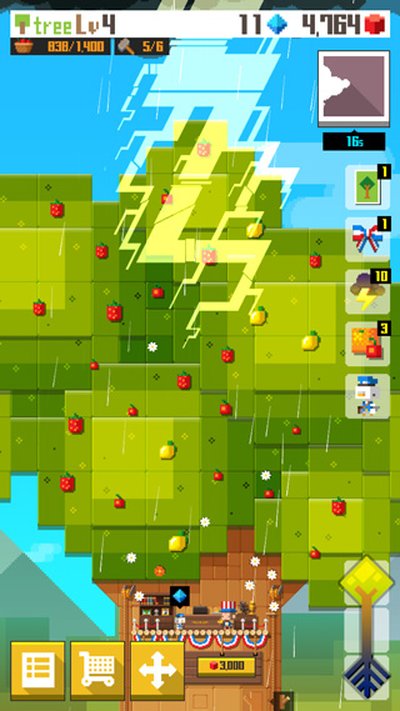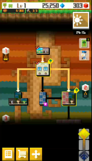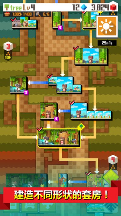这游戏地图就分三块:顶上的树枝,中间的树干,还有底下的树根。树枝负责结果子,也就是像素果,这玩意儿和钻石是游戏里的硬通货。树干是我们给小动物们起高楼的地方,而树根,就是给你盖房图纸的地方。