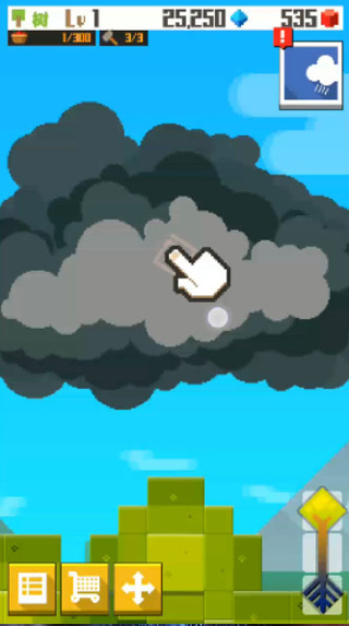 (1)树枝上结的果子,你只要对着树枝一通狂点,它一晃悠果子就往下掉,掉下来的就算你的。但有个问题,这果子长得贼慢。你可以点右上角的云彩图标飞到天上去,对着云狂点,攒出乌云打雷下雨,这样树就能快点结果。