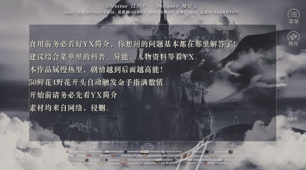 《EXO拯救黑童话》的乙女游戏,上手搓了一下午,感觉还行。这游戏就是拿EXO那几个哥们当原型做的,背景是现代都市。你扮演的女主一上来就失忆,周围人都管你叫“艾琳娜”,但个个都藏着掖着,说话说一半。为了搞清楚自己是谁、到底发生了啥,你就得跟那几个男主互动,刷好感,挖出他们藏起来的秘密。最后还得自己做个了断。这游戏已经给破了,无限鲜花加金手指,直接爽玩。