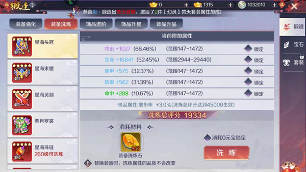 2. 装备洗炼:这个玩法对装备基础属性的提升非常大。通过洗炼,可以把属性的数值刷得更高。属性的品质分白、蓝、紫、金,颜色越好,加的属性就越多。