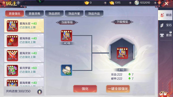 1. 强化:这是最基础的装备打造,能直接提升装备的主属性。花销也不大,只要银币够就行。强化的等级上限跟你的转生等级挂钩,所以想强化等级高,就得努力升级做转生任务。