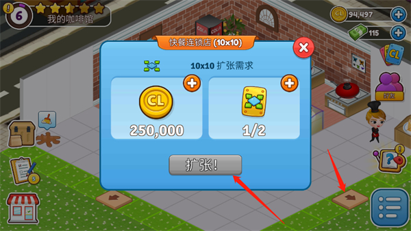 4、当餐厅空间不足时,可点击扩建按钮进行升级,但需满足相应条件。