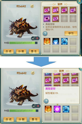 这里要注意的是,玩家在驯养宠物学习新技能前一定先考虑好,最好是用带特殊阶技能的宠物进行驯养;宠物技能数量越多,驯养想得到目标技能的难度就越大,因为你后学的技能有可能覆盖掉之前你学过而且想保留的技能,所以学习新技能前一定要谨慎哦!