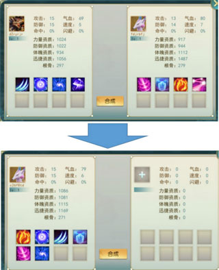 3,如是不同种的2个宠物进行合成,则合成结果的宠物各有50%几率得到合成材料的2个种类之一;